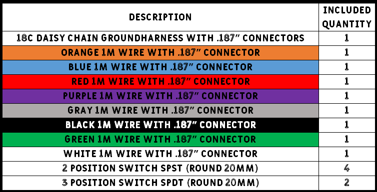 - 8 - 1m wires with .187"/4.8mm Insulated Connectors (see below for detail of colors)